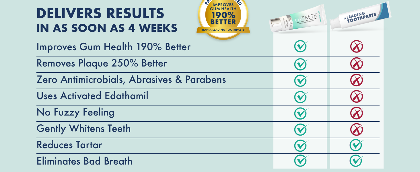 - CLINICALLY PROVEN - LIVFRESH removes plaque 250% better, improves gum health 190% more, reduces tartar, eliminates bad breath, soothes dry mouth, and gently whitens teeth better than leading toothpaste brands. Brushing with LIVFRESH can help you save thousands by improving your oral health and preventing expensive dental procedures.